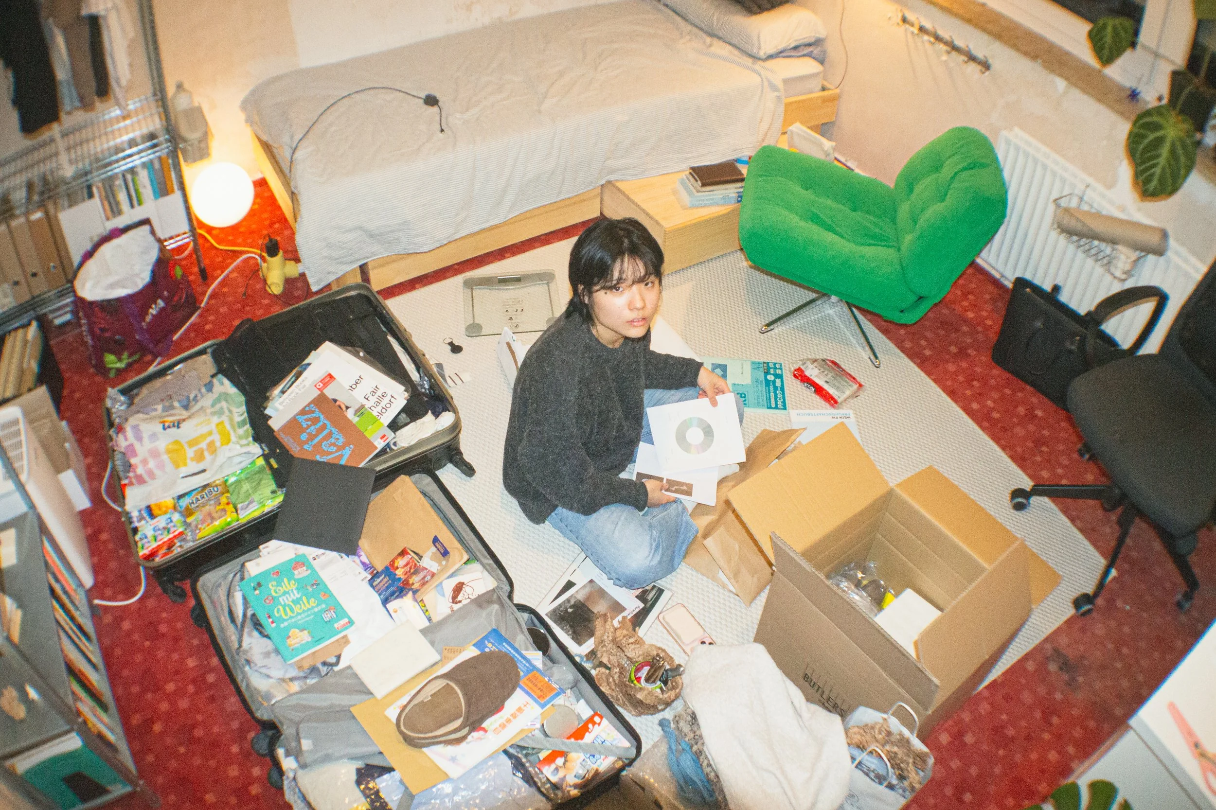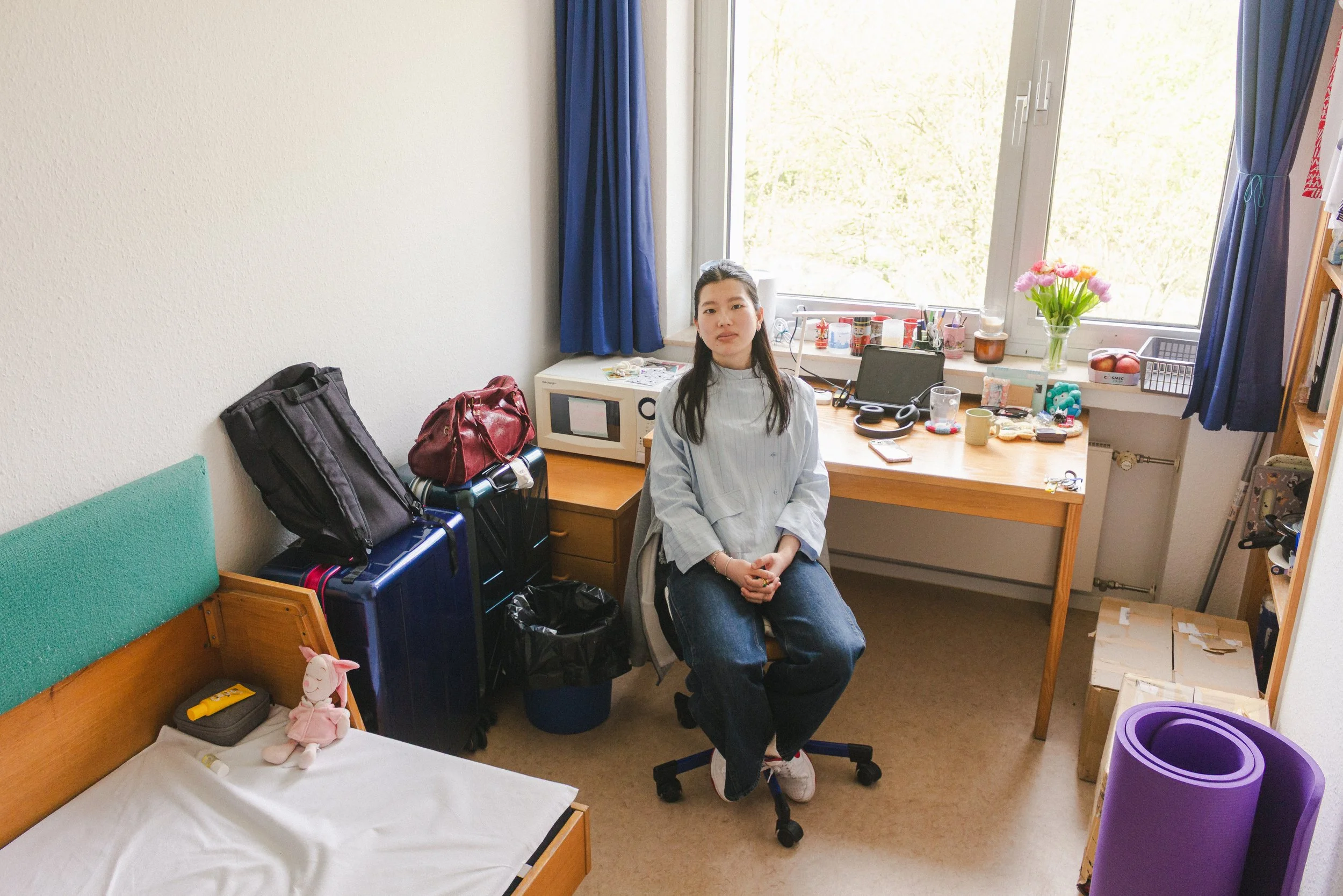 Layover is a photographic series by Mābu Nauendorff that documents the living spaces of international students in Germany. The project focuses on the everyday environments that reflect the experience of living temporarily in a foreign country. Each portrait shows how people adapt their surroundings, combining inherited items, belongings brought from home, and new purchases to create a sense of comfort and familiarity in a foreign country.
